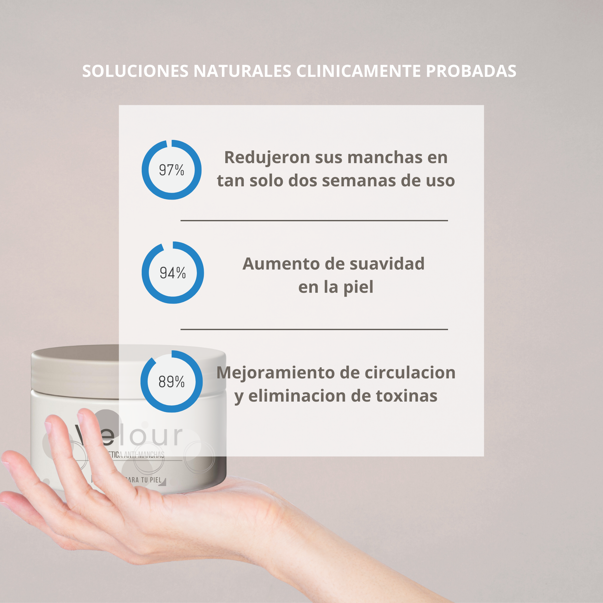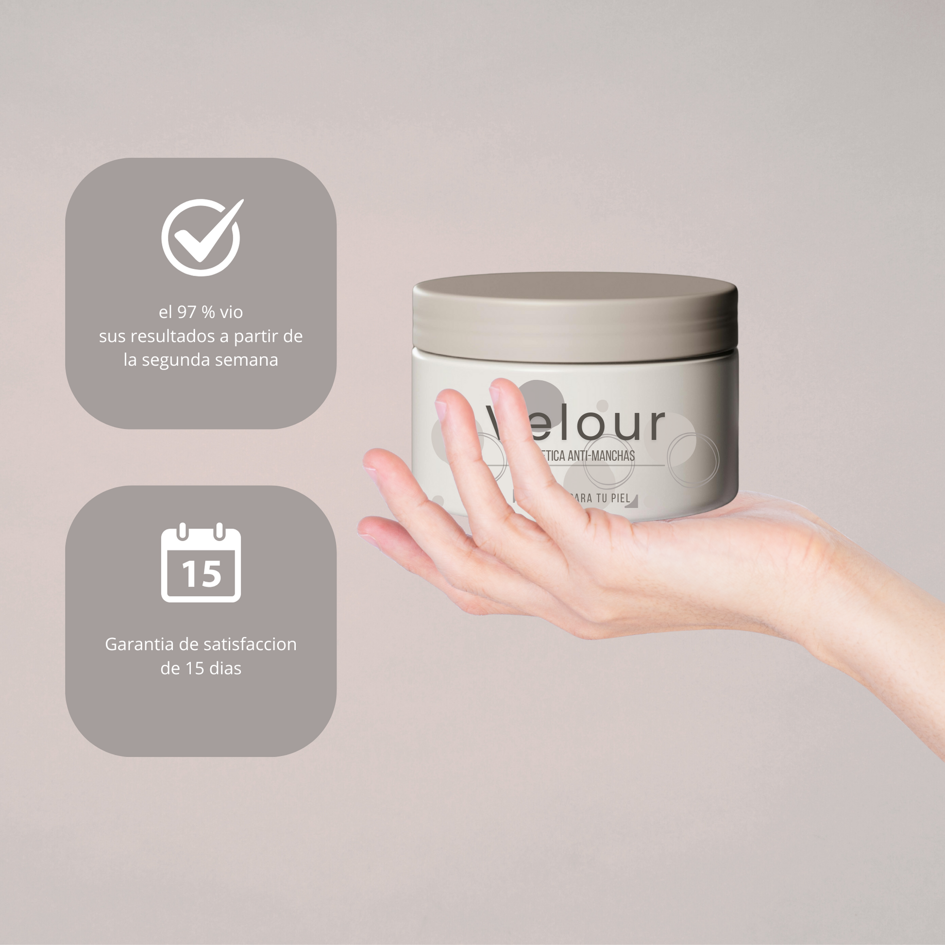 Con el uso regular de VELOUR, notarás una piel más uniforme, luminosa y sin manchas. Reduce la apariencia de imperfecciones, hidrata profundamente y mejora la textura para un rostro más suave y radiante.